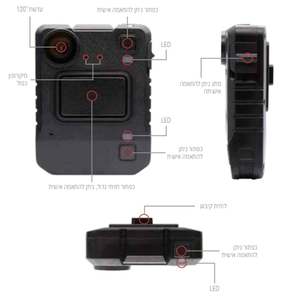 - מצלמת הגוף כוללת אפשרויות הרכבה מרובות, המתאימות לסוגי מדים שונים ותצורות ציוד המאפשרים בחירת המיקום האופטימלי לצילום והקלטת האירועים השונים.